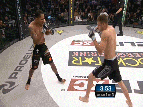 Calvin Kattar knocks Chris Foster off his feet w/ a couple of hard Low OLK’s at the end of R1 –